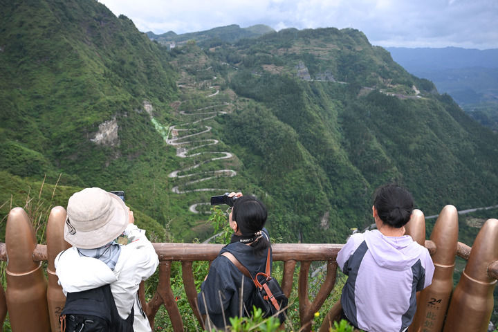 游客在贵州省晴隆县二十四道拐观景台拍照(2025年10月6日摄,无人机照片)。新华社记者 杨文斌 摄