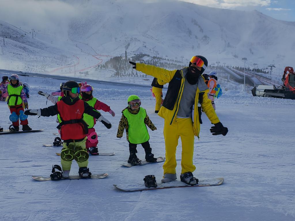 在新疆阿勒泰市将军山国际滑雪度假区,一名滑雪教练正在带领孩子们体验单板滑雪技巧。 新华社记者 孙哲 摄