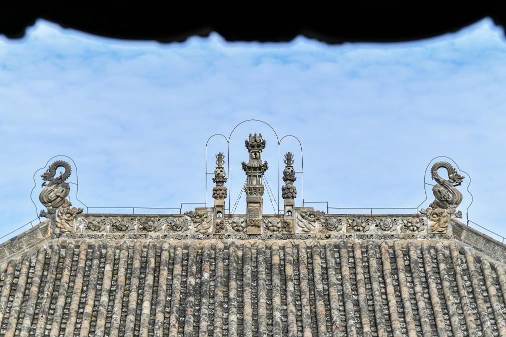 这是11月12日在山西省运城市万荣县稷王庙拍摄的古建顶上的装饰构件。