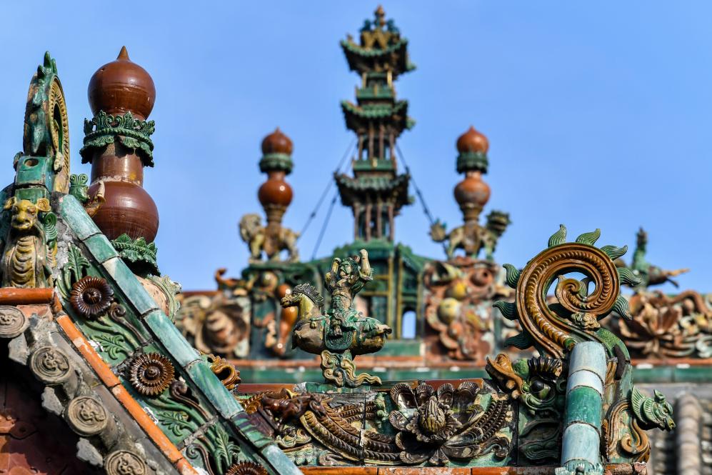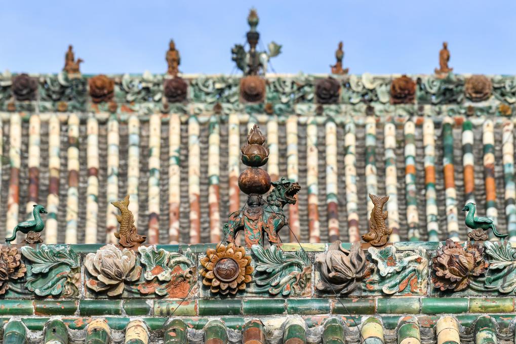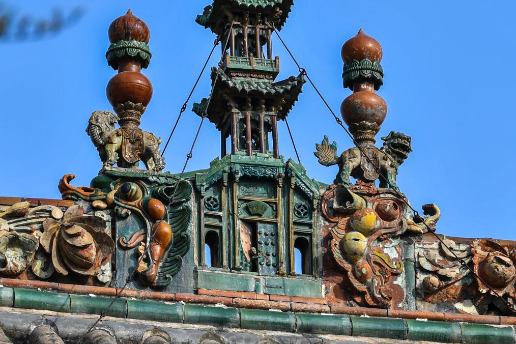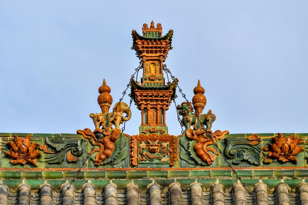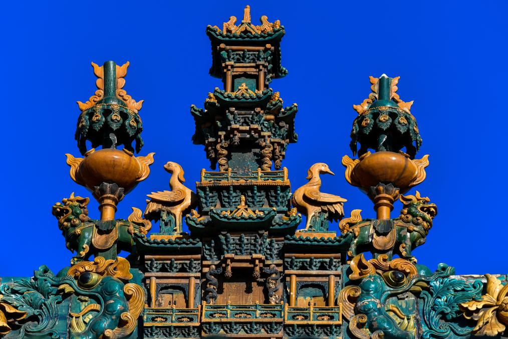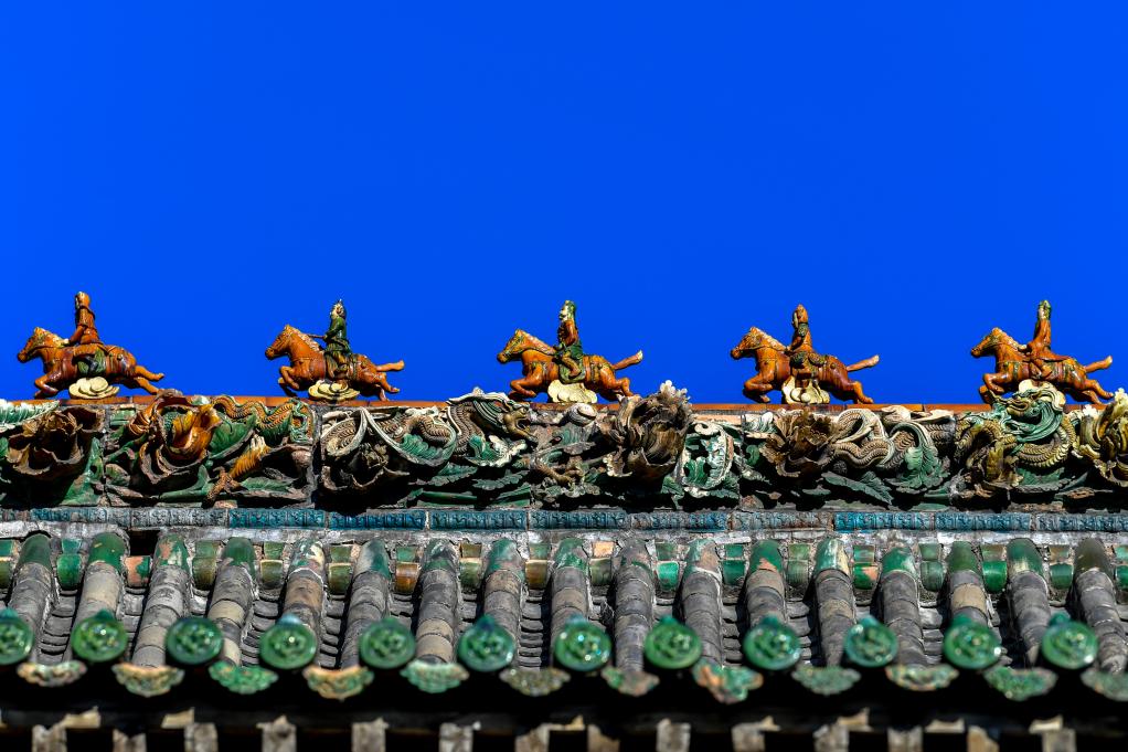 这是11月14日在山西省运城市解州关帝庙拍摄的古建顶上的装饰构件。