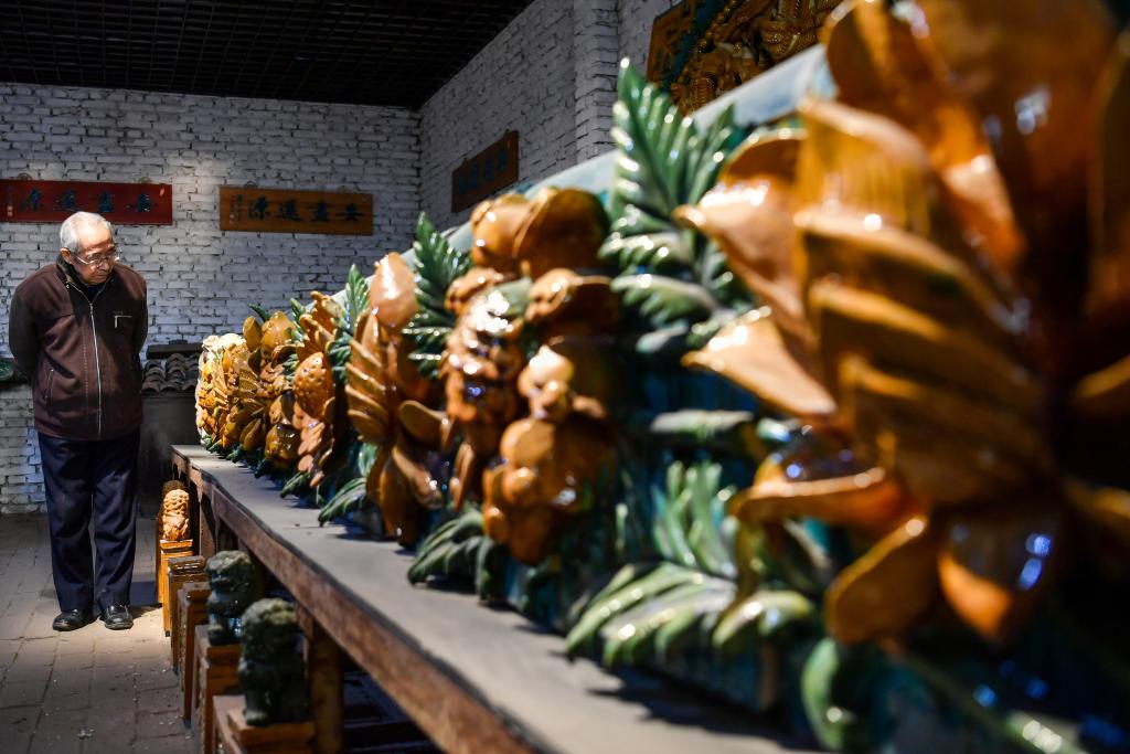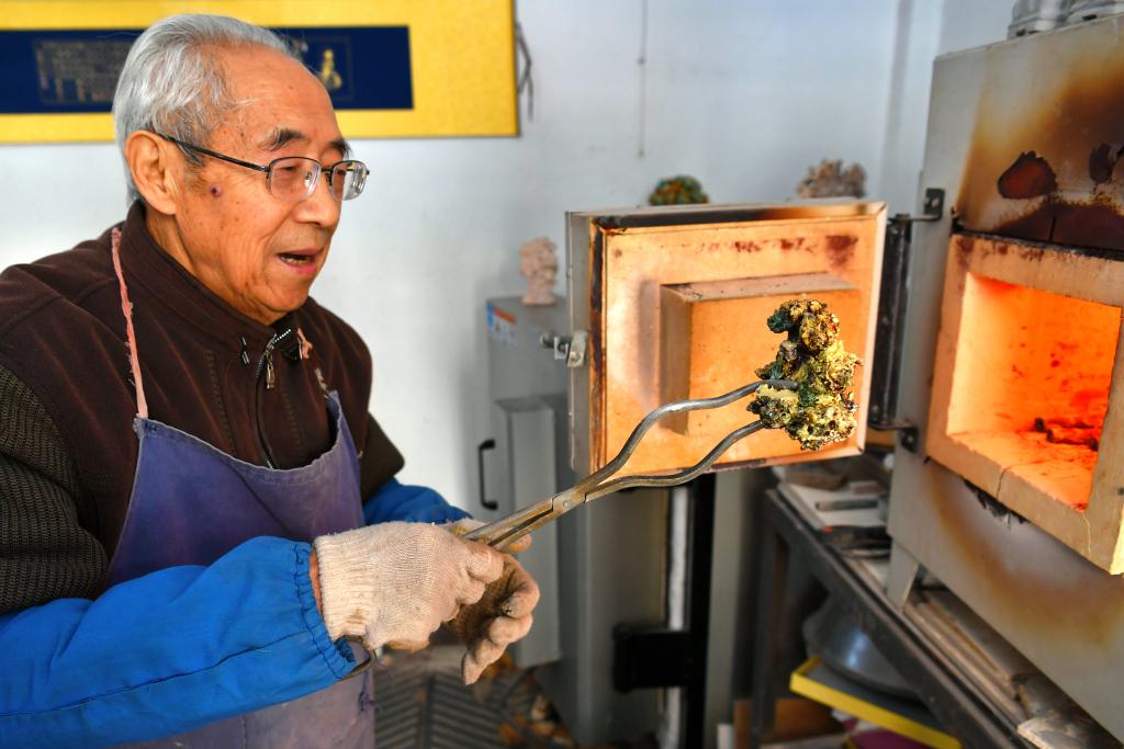 琉璃烧制技艺国家级非遗代表性传承人葛原生在位于山西省太原市的工作室里制作琉璃工艺品。