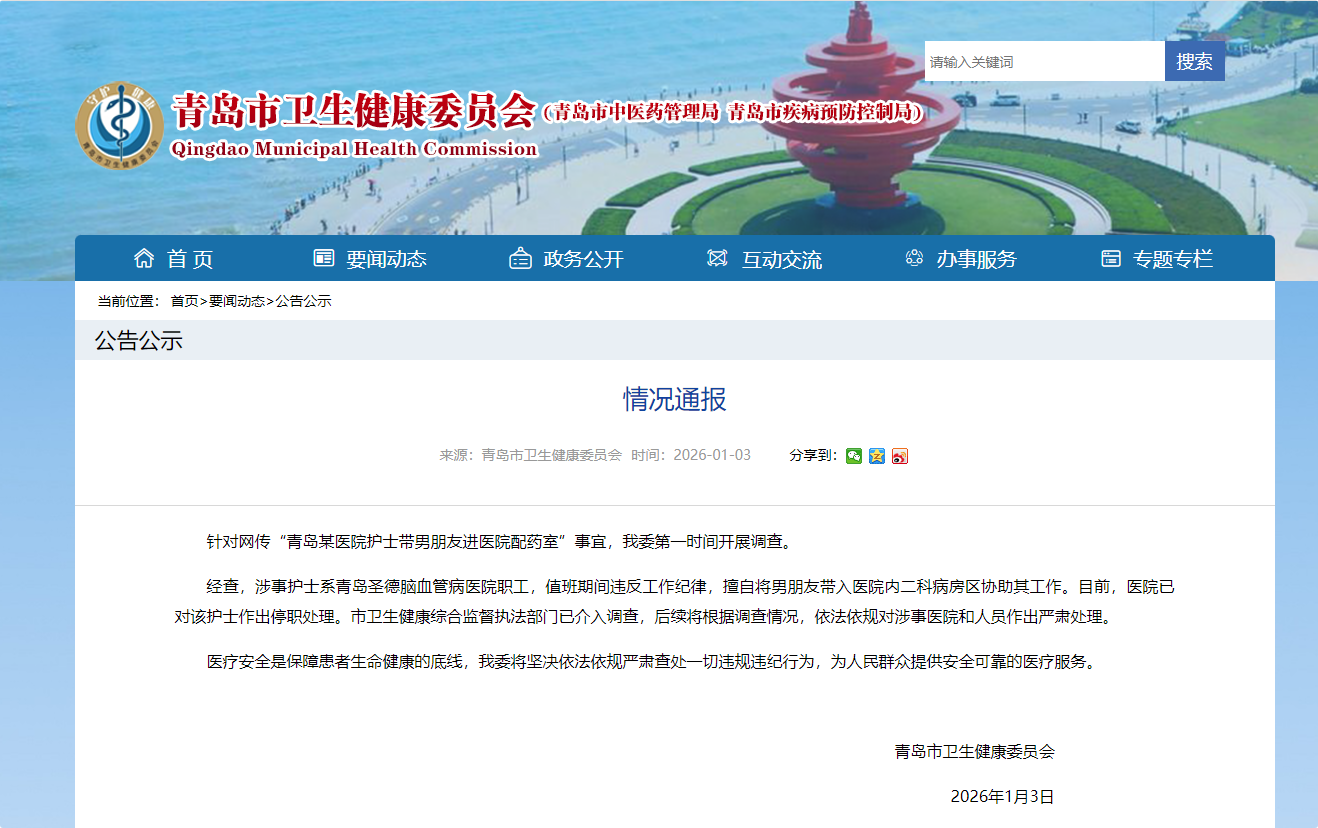 针对网传“青岛某医院护士带男朋友进医院配药室”事宜,青岛市卫健委3日在官网发布情况通报称,该委第一时间开展调查。
