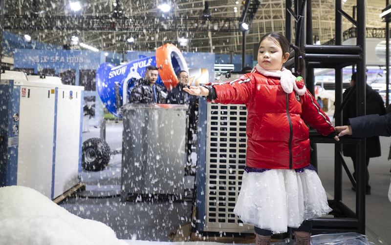 2026年1月6日,在2026哈尔滨国际冰雪经济博览会冰雪装备展区,小朋友触摸制雪机现场制造的雪花。新华社发(张春雷 摄)