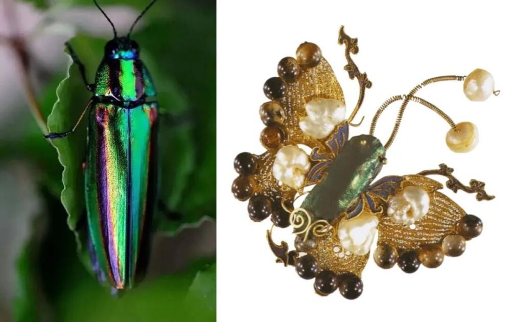 左:玉虫。右:故宫博物院藏“金镶珠石蝴蝶簪”。