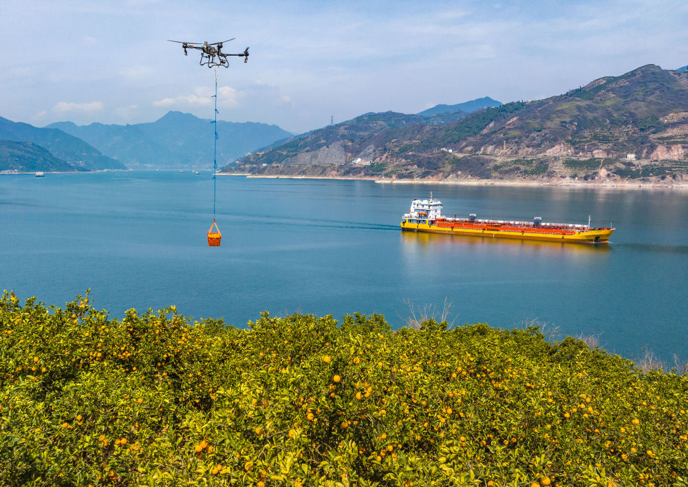 2025年3月17日,湖北省秭归县郭家坝镇邓家坡村村民用无人机转运脐橙(无人机照片)。新华社发(郑家裕摄)