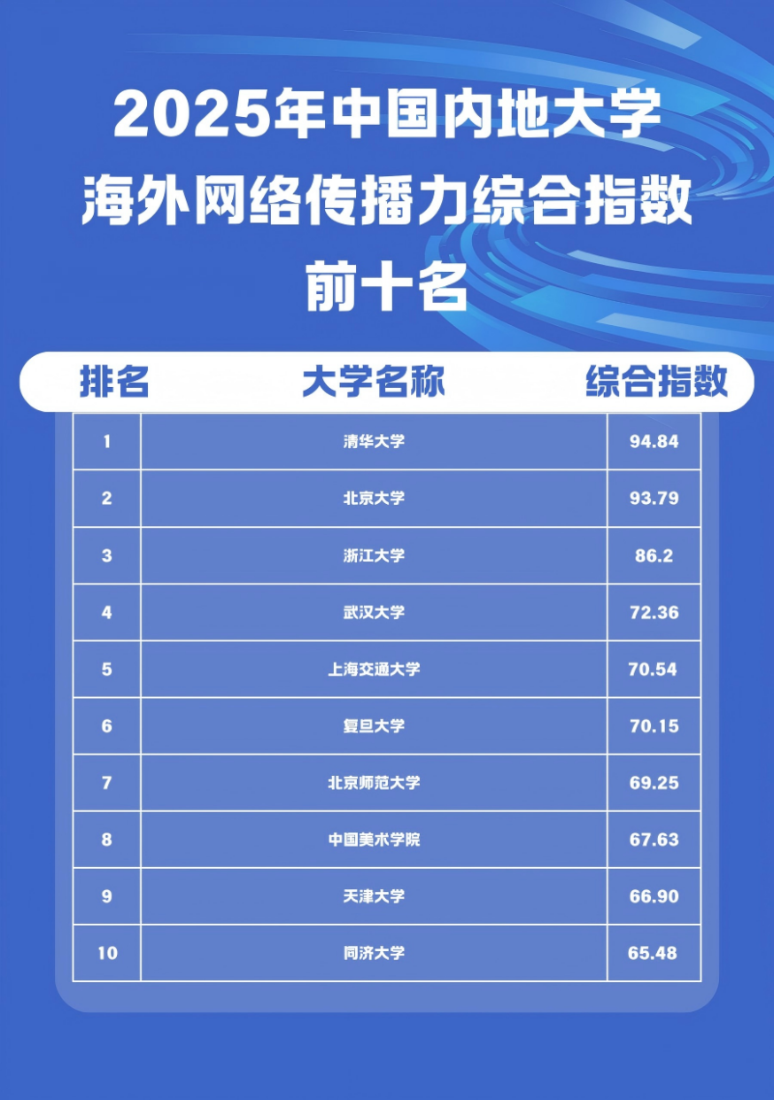 《2025中国大学海外网络传播力建设报告》显示,2025年的中国193所大学海外传播力综合指数排名前十名大学依次为:清华大学、北京大学、浙江大学、香港科技大学、香港大学、香港理工大学、香港城市大学、武汉大学、台湾大学、上海交通大学。中国内地大学排名前十位依次是:清华大学、北京大学、浙江大学、武汉大学、上海交通大学、复旦大学、北京师范大学、中国美术学院、天津大学、同济大学。