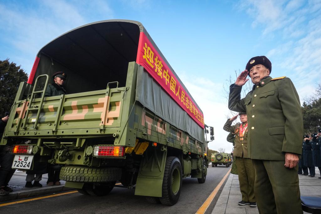 2024年11月28日,运送第十一批在韩中国人民志愿军烈士遗骸的车辆驶向沈阳抗美援朝烈士陵园,程茂友(右)向志愿军烈士敬礼。