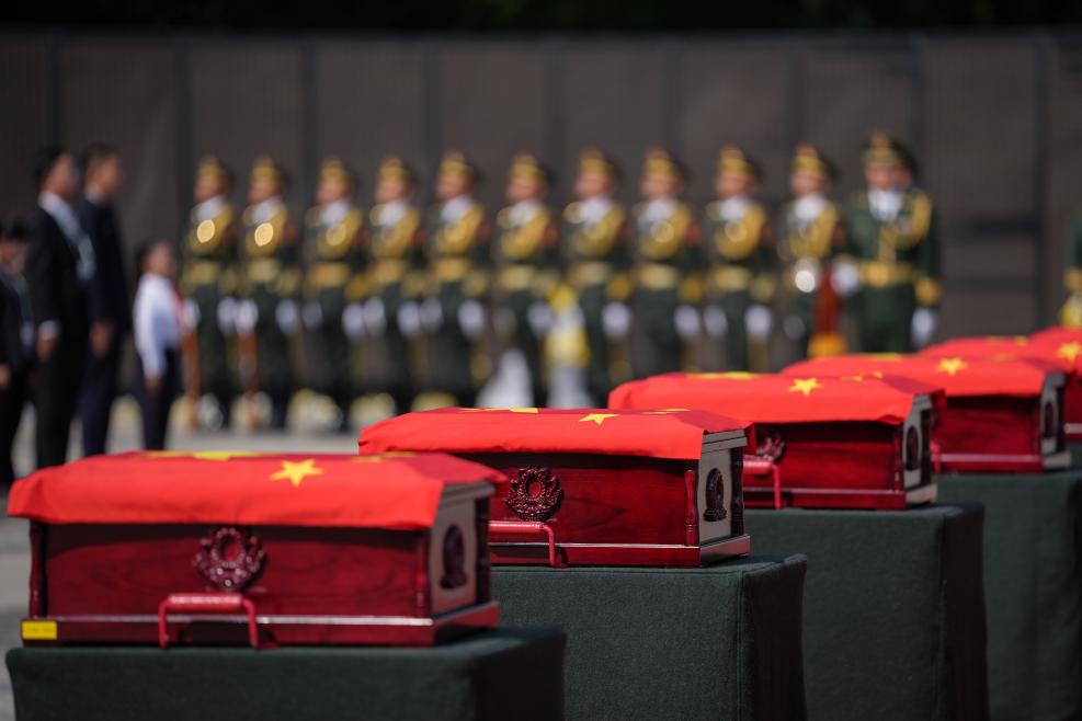2025年9月13日,这是在第十二批在韩中国人民志愿军烈士遗骸安葬仪式中拍摄的殓放志愿军烈士遗骸的棺椁。