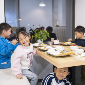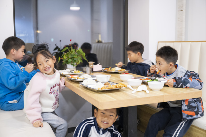 2025年11月25日,放学的小朋友在春明北社区食堂内用餐。在容东片区,春明北社区食堂瞄准了“接娃难”的民生痛点,每天傍晚为周边学生提供营养实惠的晚餐,有效减轻双职工家庭负担。新华社记者 伍志尊 摄