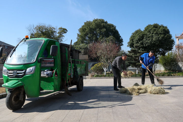 2026年1月14日,在浙江省杭州市余杭区普宁村,工作人员(右)来到村民家中回收垃圾。新华社记者 江汉 摄
