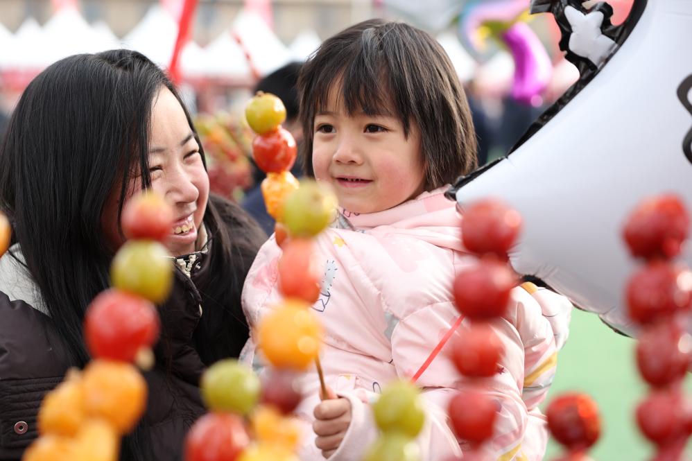 家长和孩子在年货大集上挑选糖葫芦。新华社记者 陈斌 摄