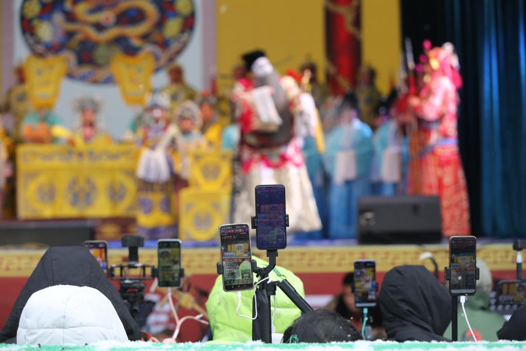 自媒体博主在年货大集上直播秦腔演出。新华社发(王克贤 摄)
