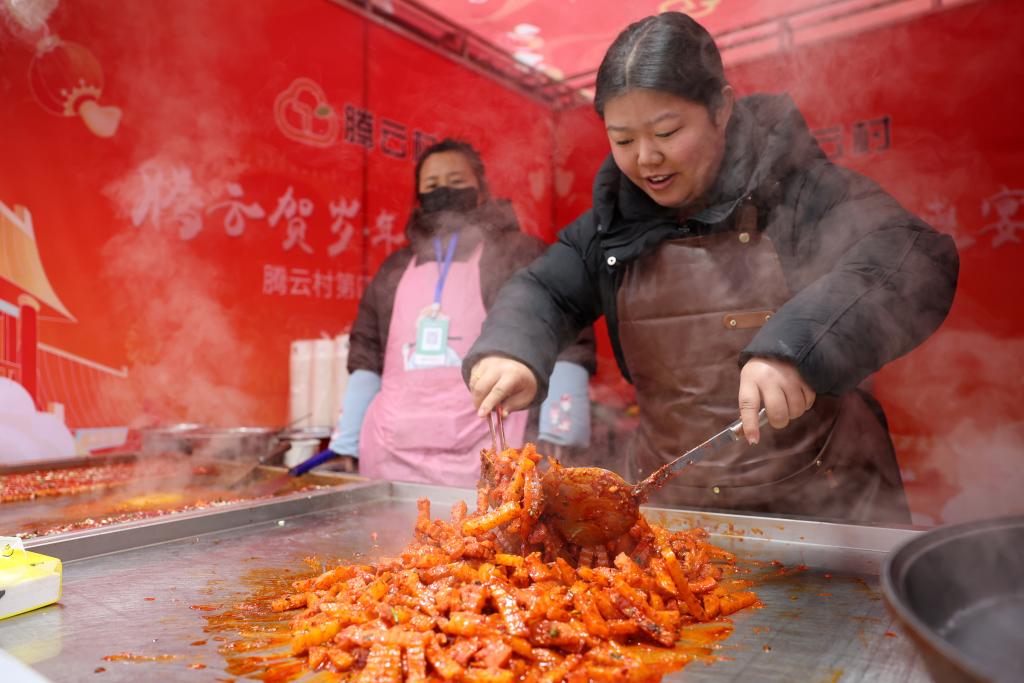 一位摊主在年货大集上制作铁板狼牙土豆。新华社记者 陈斌 摄