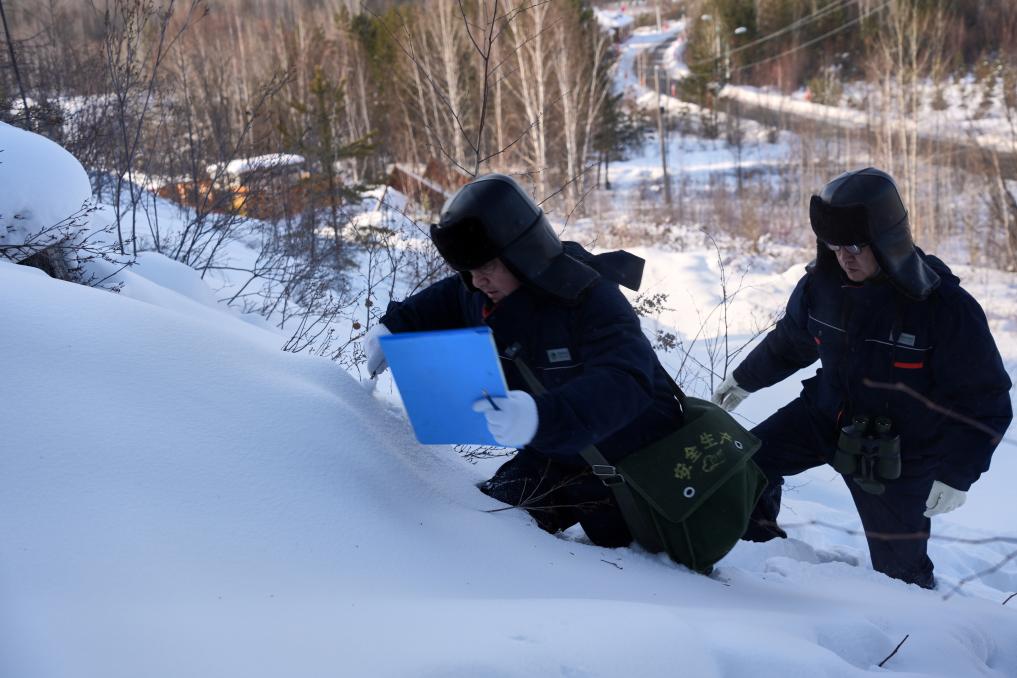 吕建生(右)和同事金建龙在林海雪原巡线。新华社记者 徐凯鑫 摄