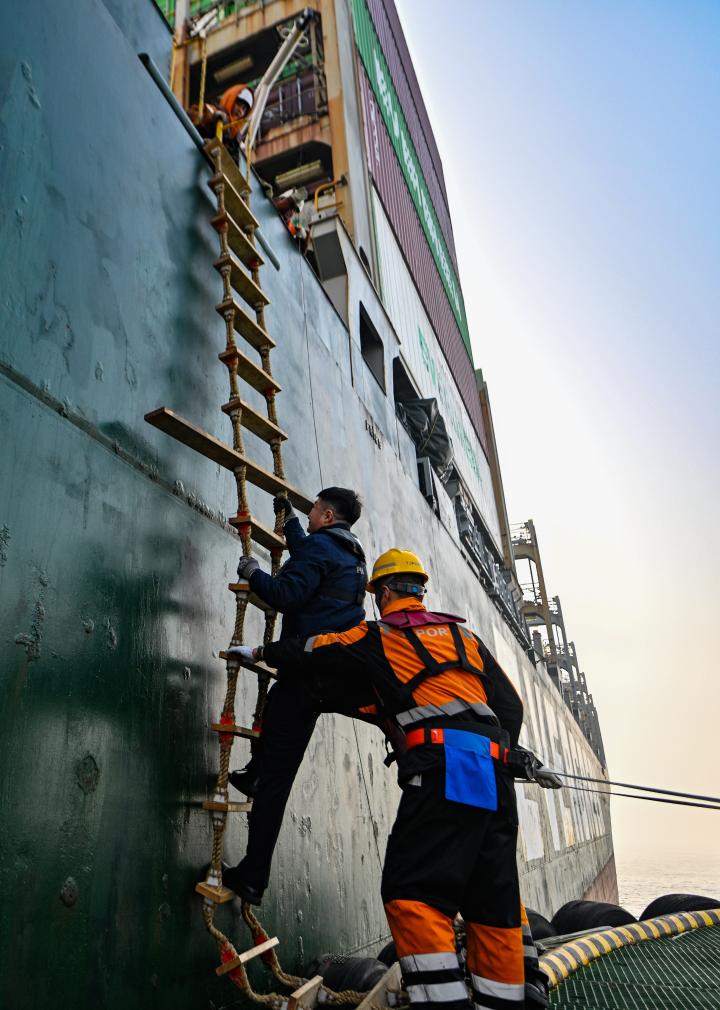 天津港引航中心引航员孙勃(左)从拖轮上攀爬软梯登船。新华社记者赵子硕 摄