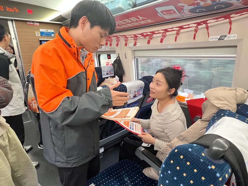 返乡专列上,一场别开生面的“移动春招会”同步展开。乘客现场扫描二维码,可查阅到荆门近2.6万个招聘岗位信息。“老乡们,要是大家年后想在家门口就业创业,可以随时联系我们。”荆门市人社部门工作人员郑文杰的一席话,温暖又亲切。
