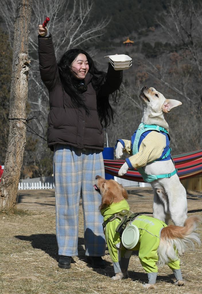 1月31日,在北京市昌平区“北京犬时代宠物公园”内的宠物庙会上,宠物主人与爱犬互动。