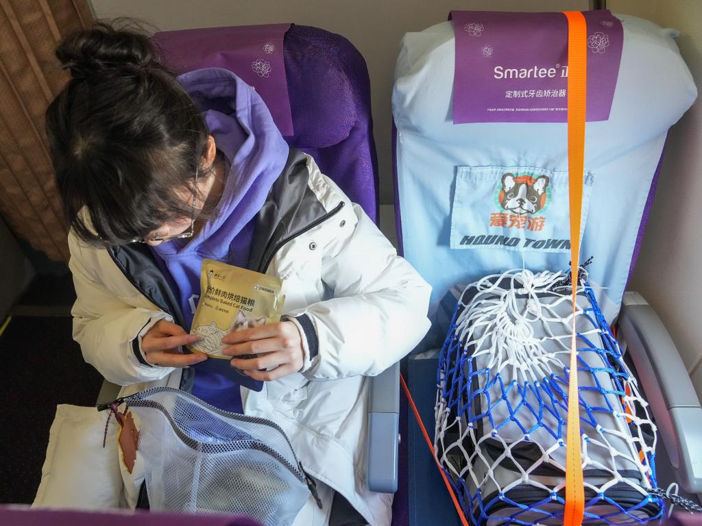 2月3日,在上海飞往成都的HO1059次航班上,吉祥航空工作人员将宠物猫“好好”搬进机舱。