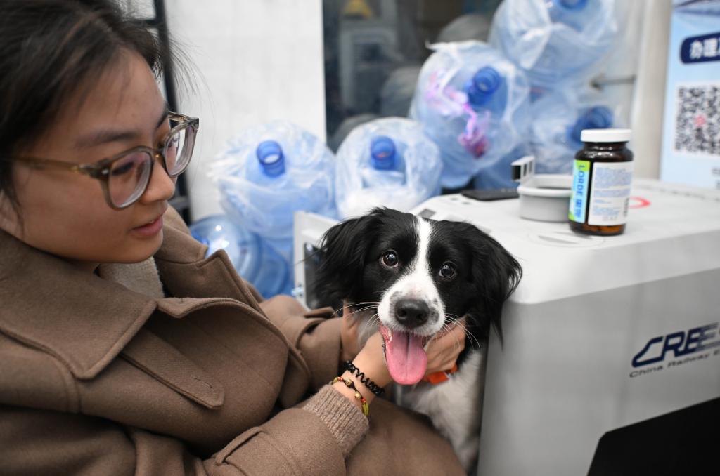 2月6日,在合肥南站站台,工作人员在“高铁宠物运输箱”装车前查看宠物状态。
