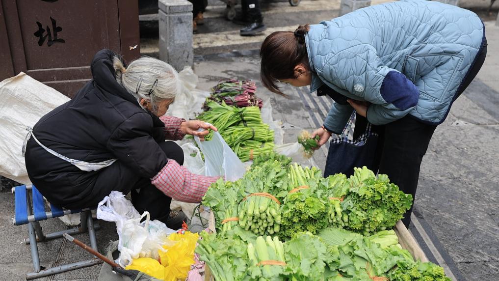 2月13日,一位市民正在挑选左福秀乘坐“惠农专线”带来的新鲜蔬菜。新华社记者刘勤兵 摄