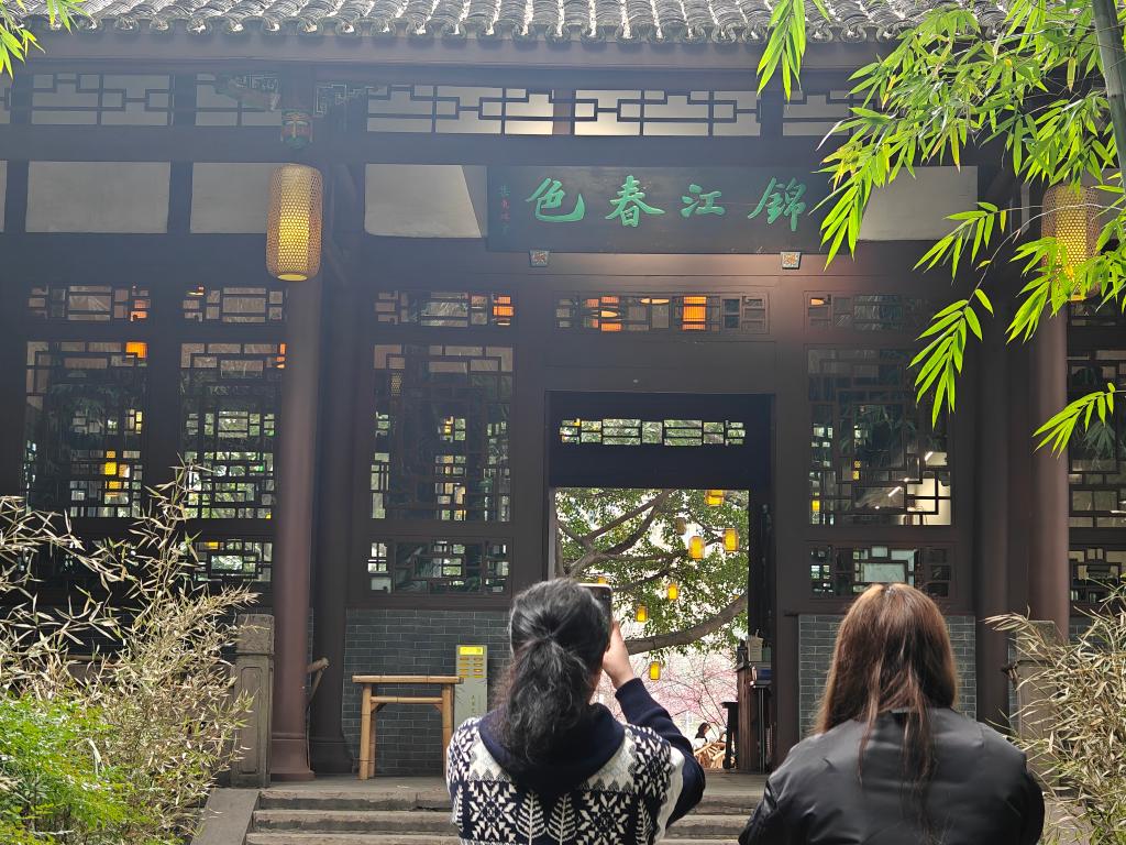 市民正在“锦江春色”牌匾前拍照留念。新华社记者 谢佼 摄
