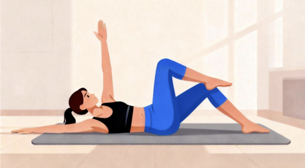 2.侧向伸展:站立位,双脚与肩同宽,双手交叉举过头顶;向左侧缓慢弯腰,直到右侧腰部有拉伸感(不要扭转身体),保持15-20秒,回到中立位后换侧重复,每侧2-3组。