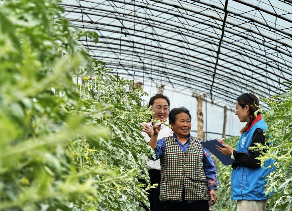 2024年4月9日,北京市大兴区庞各庄镇李家巷村政务服务站的工作人员来到大棚内为瓜农办理社保业务。