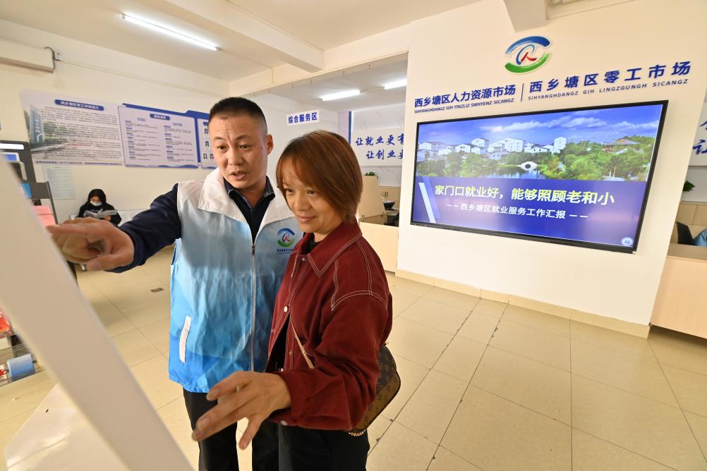 2025年12月10日,在广西南宁市西乡塘区零工市场,工作人员(左)指导市民查找就业招聘信息。