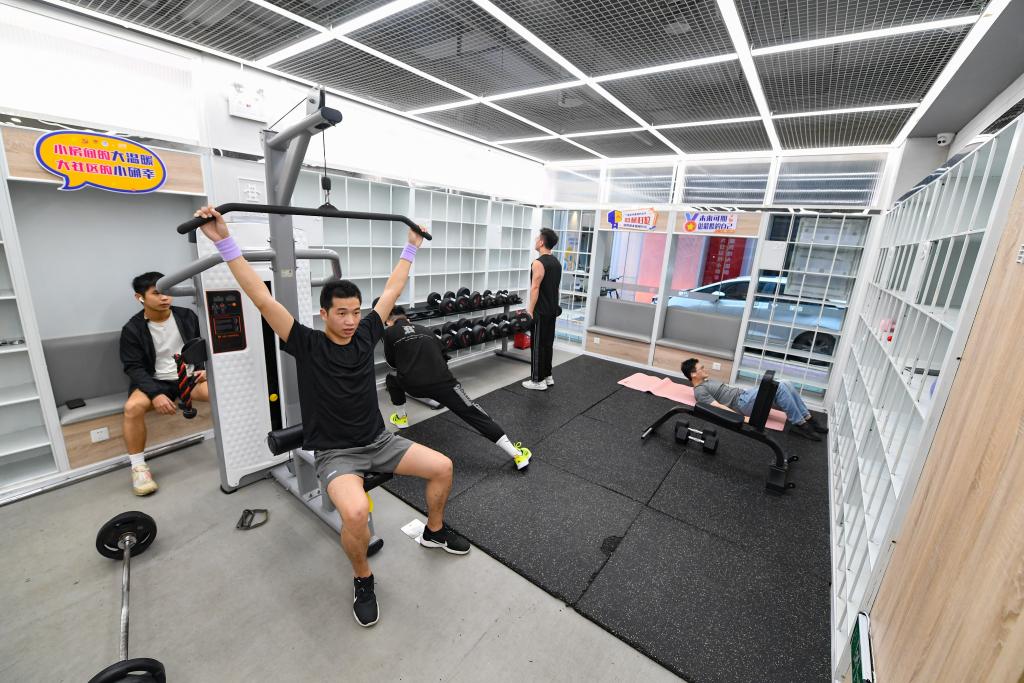 2023年4月2日,在广东省深圳市龙华区元芬村,青年公寓住户在社区增设的健身房锻炼。元芬村曾是深圳市典型的城中村,经过改造后成为干净、整洁、现代的新青年社区。