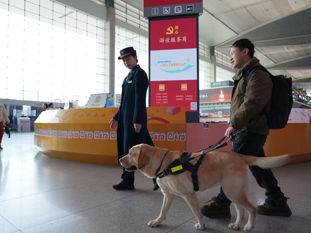 新华社成都2月26日电(记者薛晨)24日下午,四川省绵阳市安州站候车厅里,视障旅客兰先生在导盲犬“拿铁”的陪伴下,跟随工作人员,稳步走向重点旅客候车区,准备返回成都工作。距离C9464次列车发车还有30分钟,兰先生坐下休息,已卸下导盲鞍的“拿铁”和主人亲昵玩闹起来。