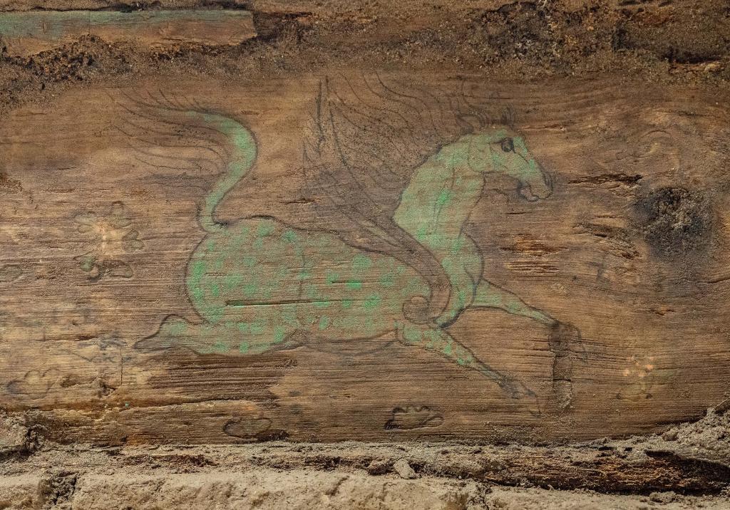 这是木棺座壸门内的彩绘“翼马”图案。新华社记者 李贺 摄