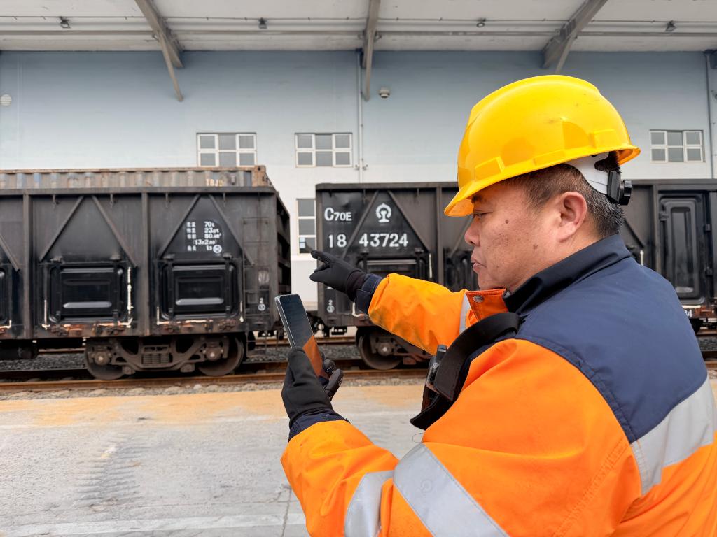 外勤货运员杜峰正在认真核对车辆箱号。新华社记者 张钟仁 摄