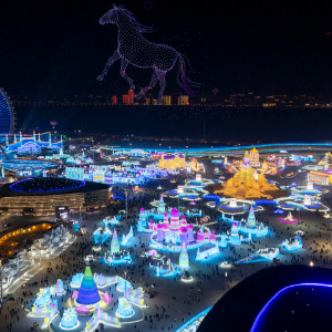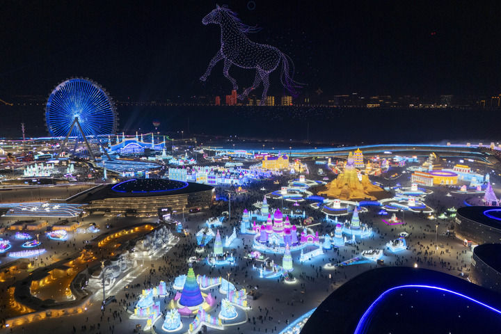 1月5日拍摄的哈尔滨冰雪大世界园区的无人机表演(无人机照片)。新华社记者 张涛 摄