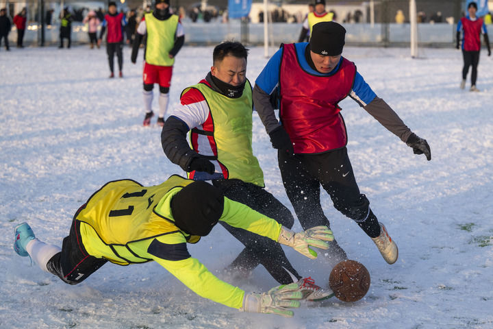 2025年12月20日,哈尔滨冰城首届“冰雪绿茵”大众雪地足球挑战赛开幕。新华社记者 张涛 摄