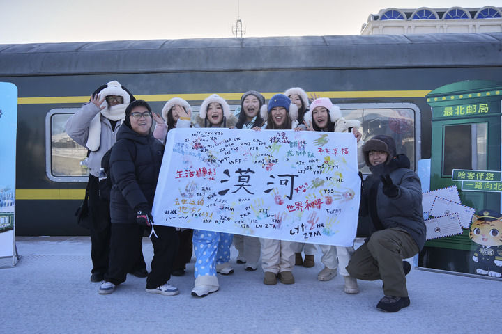 1月27日,游客在漠河站展示手绘画作。新华社记者 王祚 摄