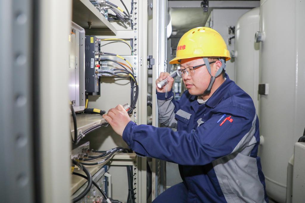 工作人员正在进行微机I/O信号确认作业。新华社发(李信宏摄)