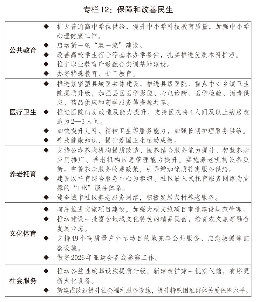 二是构建优质均衡公共服务体系。稳步推进基本公共服务均等化。适应学龄人口变化,优化学前和义务教育资源配置,增加普通高中学位供给和优质高校本科招生。全面推进健康学校建设。深化实施医疗卫生强基工程,完善国家区域医疗中心管理体制和运行机制,促进优质医疗资源扩容下沉和区域均衡布局,加强县区、基层医疗机构运行保障。支持心理健康和精神卫生、妇女儿童健康服务体系建设,实施康复护理扩容提升工程。健全公共卫生防控救治体系。加强慢性病、罕见病防治,全方位提升急诊急救、血液保障和应急能力。推进中医药传承创新,促进中西医结合。推出促进银发经济高质量发展的增量政策,培育发展银发经济龙头企业,推进老年人力资源开发,更好满足老年人多元化需求。发展医养结合服务,推行长期护理保险,健全失能失智老年人照护体系。实施早孕关爱行动、孕育和出生缺陷防治能力提升计划。发挥育儿补贴作用,完善生育保险、生育休假等制度。推进普惠养老托育服务体系建设,提升社区养老托育等服务能力。加强公共设施适老化和无障碍改造。推进高质量户外运动目的地建设,开展群众身边体育运动空间扩容。积极培育群众赛事。深化家政产教融合,持续推进家政服务业提质扩容。完善困境儿童服务保障体系,支持社会福利设施建设。