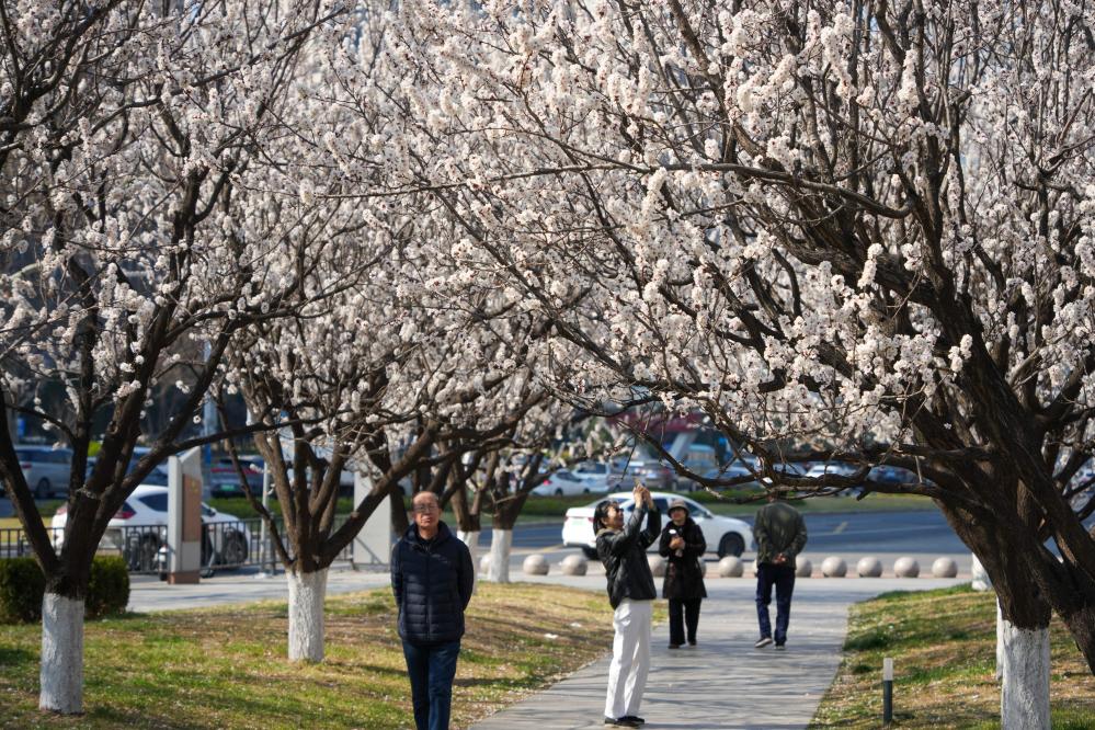 3月19日,在济南市区,人们在观赏杏花。近日,山东省济南市气温回升,市区里杏花陆续盛开,为城市增添了春天的气息。新华社记者 徐速绘 摄