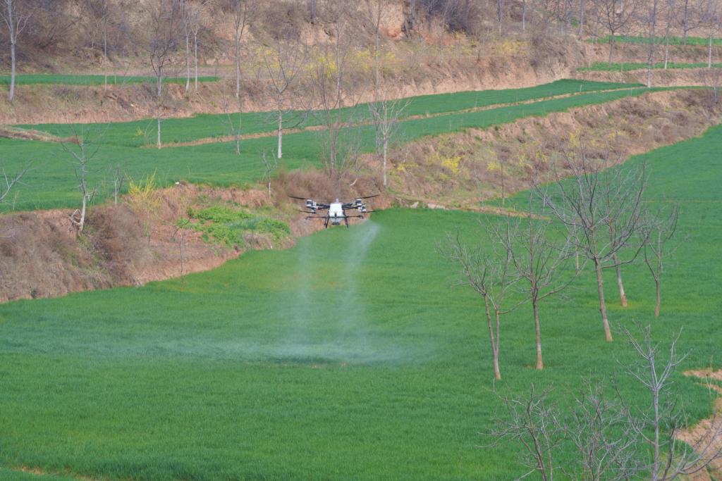 甘肃省陇南市成县苏元镇水坝村,无人机正在为小麦开展喷防服务(无人机照片)。(陈争强 摄)