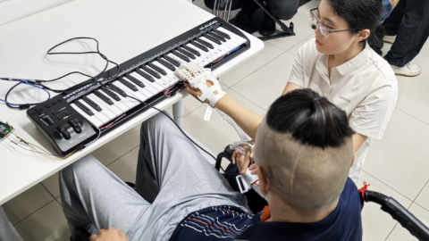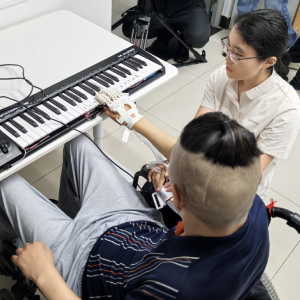 在团队成员协助下,患者尝试练习脑控弹琴。