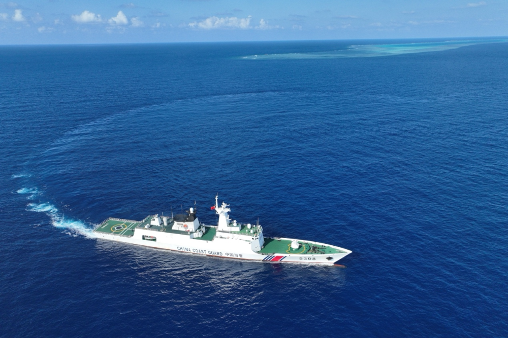 3月24日,海警三都舰在南海某海礁周边巡逻(无人机照片)。新华社记者 毛俊 摄
