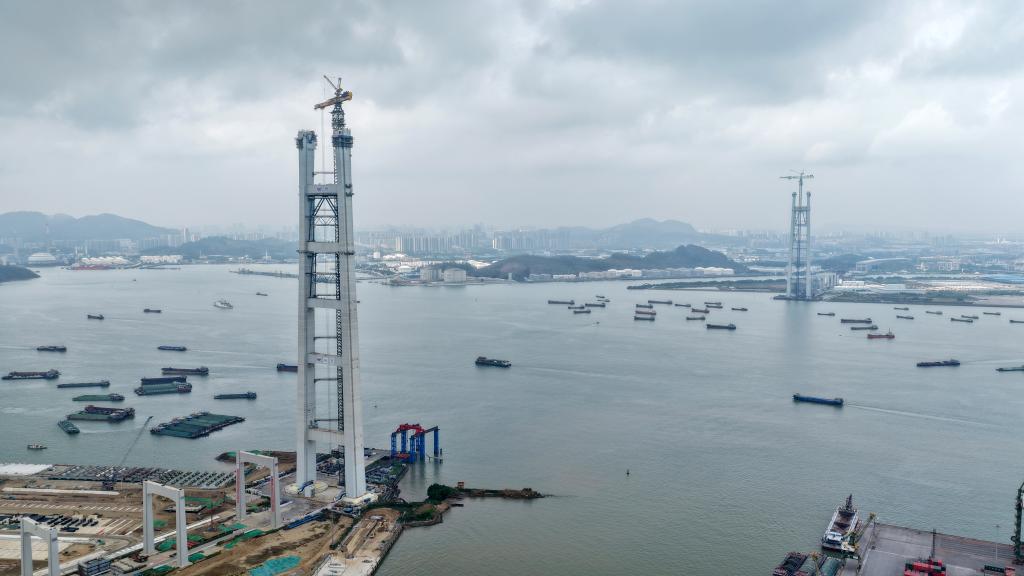 这是3月26日拍摄的粤港澳大湾区核心枢纽工程狮子洋大桥东、西主塔(无人机照片)。新华社记者 卢汉欣 摄