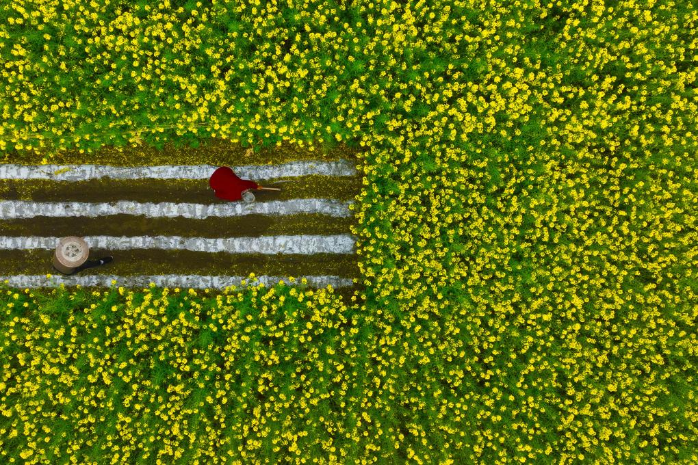 3月12日,游客乘船驶过重庆潼南崇龛花海景区(无人机照片)。新华社记者 王全超 摄