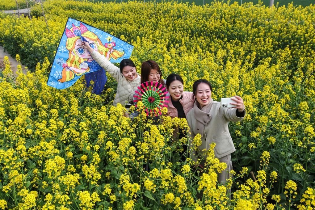 3月26日,河南省焦作市博爱县金城乡韩庄村,游客在油菜花旁拍照打卡。新华社发(程全摄)