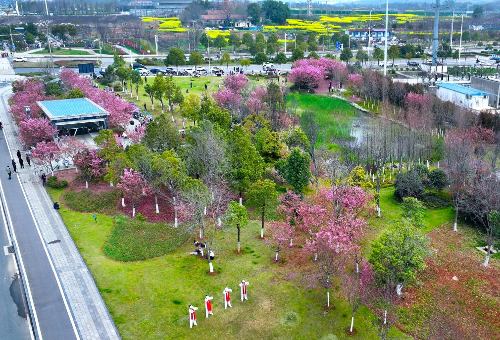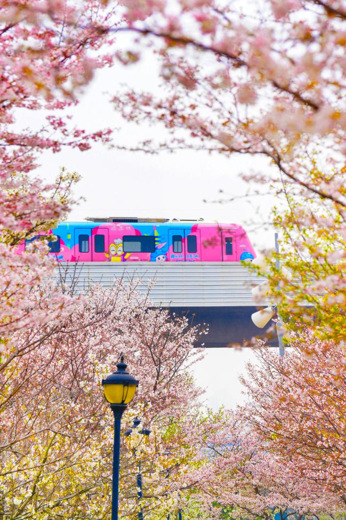 不只是油菜花田。从三店站乘地铁向北行驶一站,便是码头潭公园,园内樱花正盛。上午10时许,一列粉色涂装的“樱花专列”缓缓驶入车站,与满树繁花相映成趣,吸引不少摄影爱好者驻足拍摄。