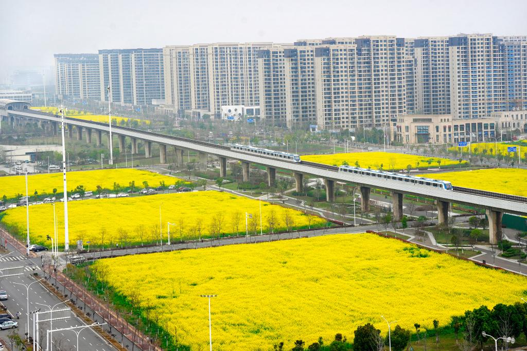 春日的武汉,繁花似锦。在武汉地铁1号线径河站至三店站之间,线路两侧的百余亩油菜花盛放,绵延逾一公里。列车穿行于金色花海,天空中不时有飞往机场的航班掠过,都市与自然交织成一幅生动的春日画卷。