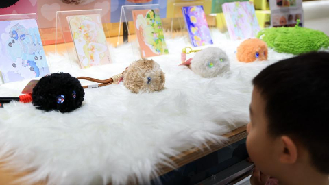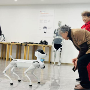 浙江乌镇智能养老中心内,院内老人正与机器狗互动。新华网发(钟月英 摄)