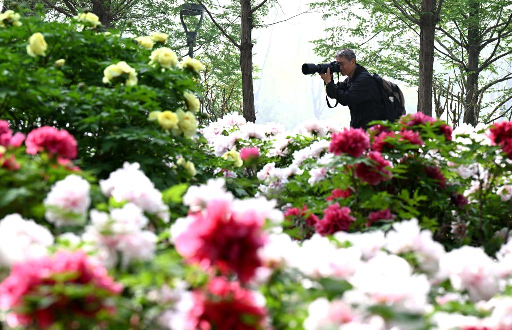 4月18日,摄影爱好者在河北省石家庄市植物园牡丹园拍照。新华社发(陈其保摄)