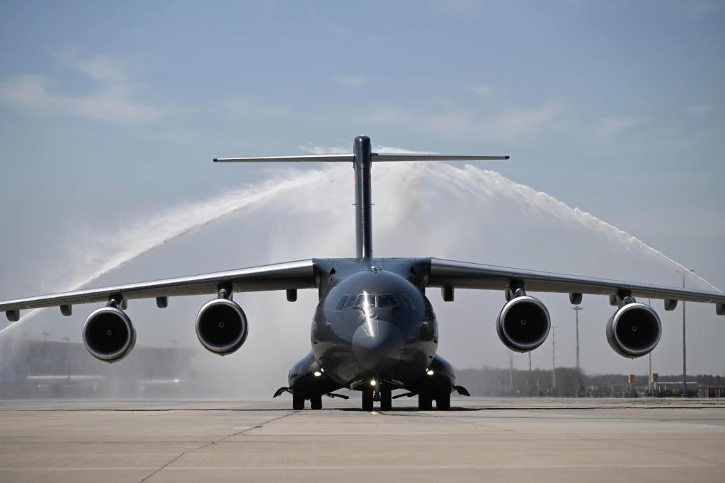 4月22日,接迎第十三批在韩中国人民志愿军烈士遗骸回国的空军运-20B飞抵沈阳,4架歼-20战机护航。4月22日上午,第十三批在韩中国人民志愿军烈士遗骸由中国空军运-20B从韩国接回辽宁沈阳。12位志愿军烈士英灵及146件遗物回到祖国怀抱。新华社记者 杨青 摄