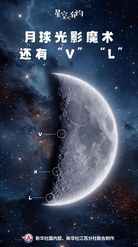 王科超提示,24日晚公众在观测“月面X”的时候,沿着月球晨昏线上下扫视,还可以试着寻找“月面V”和“月面L”。“月面V”位于月球赤道附近,由乌克特环形山及其周围山脊的光影交织而成;沿着晨昏线向南看去,由月面环形山等地形阴影勾勒出的“月面L”也值得一观。
